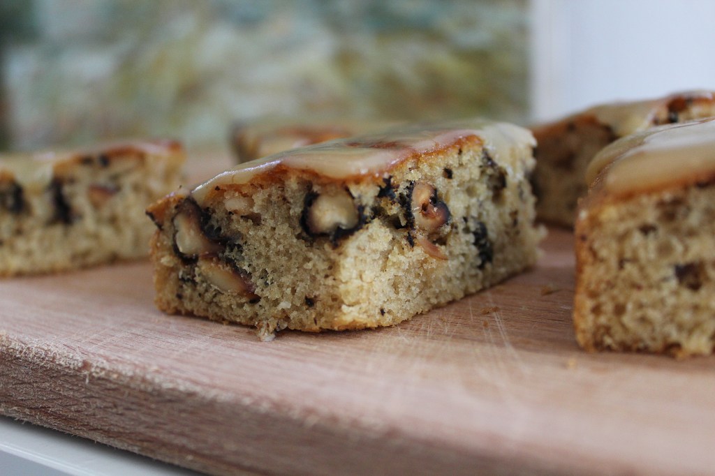 Add the flour to the previous mixture, and finally, the walnuts. Pour the mix in a baking tin and bake it over for 40 to 45 minutes.