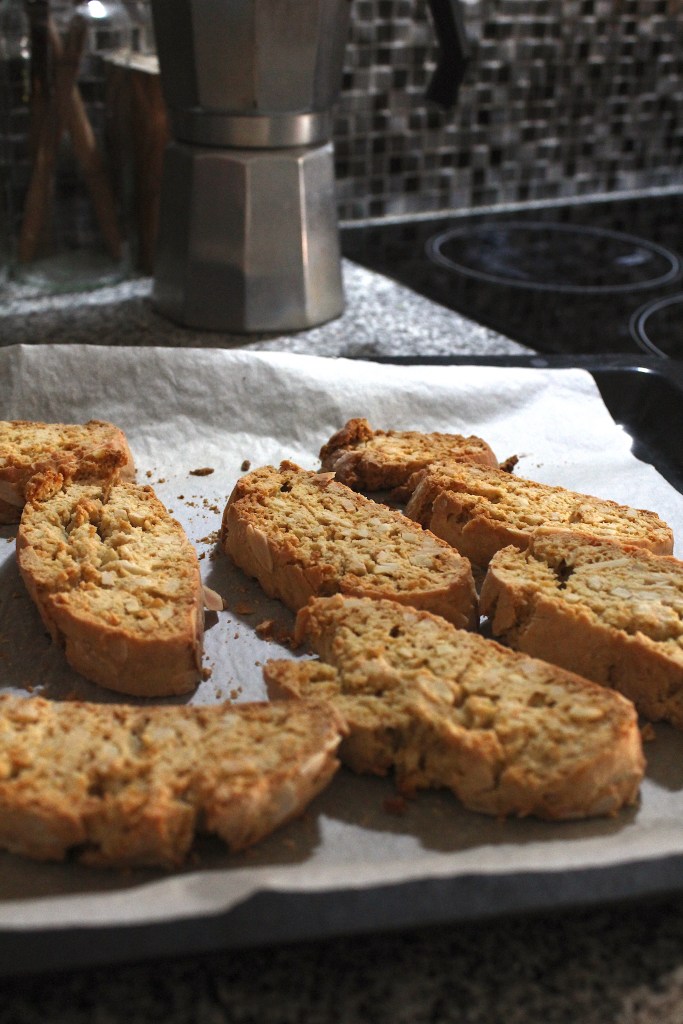 Cortar às fatias – eu gosto dos biscoitos bem grossos -, e levar novamente ao forno durante 8 a 10 minutos, ou até ficarem dourados. Não esquecer virar as fatias!