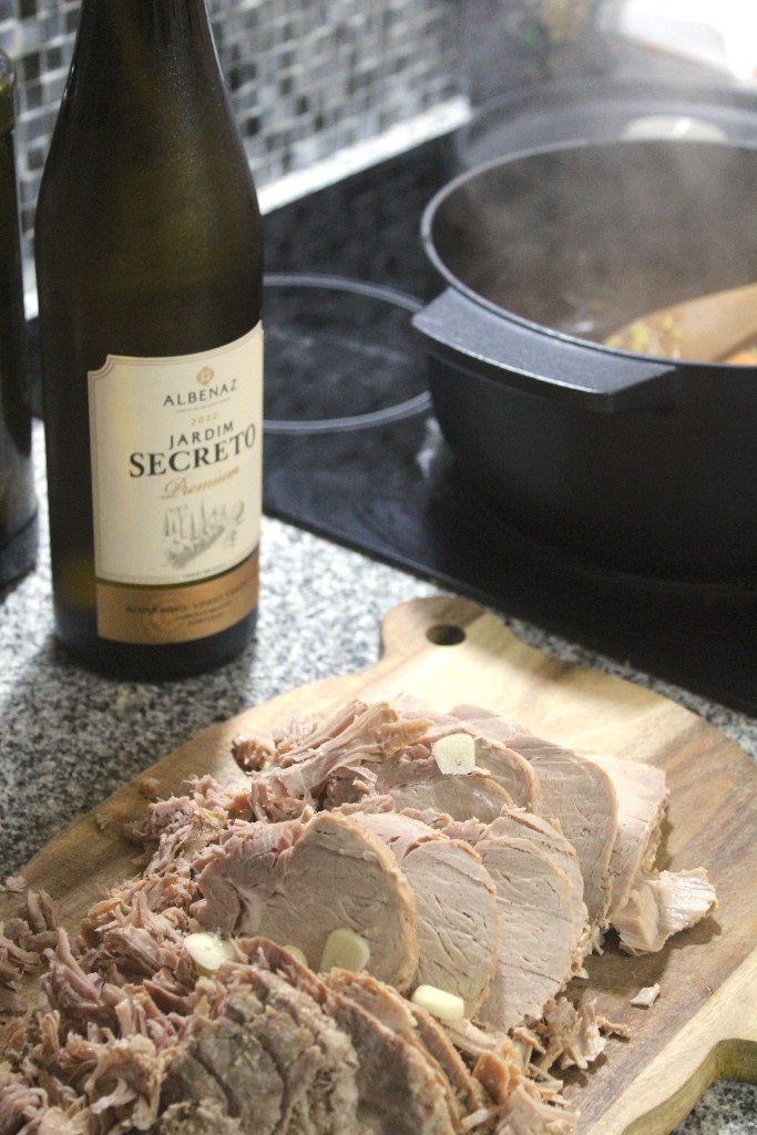 * Usei um lombo de porco. Antes de o usar na receita de ragu, fervi em água com um pouco de sal e ervas, um raminho de tomilho. Cozinhei aproximadamente 20 minutos.