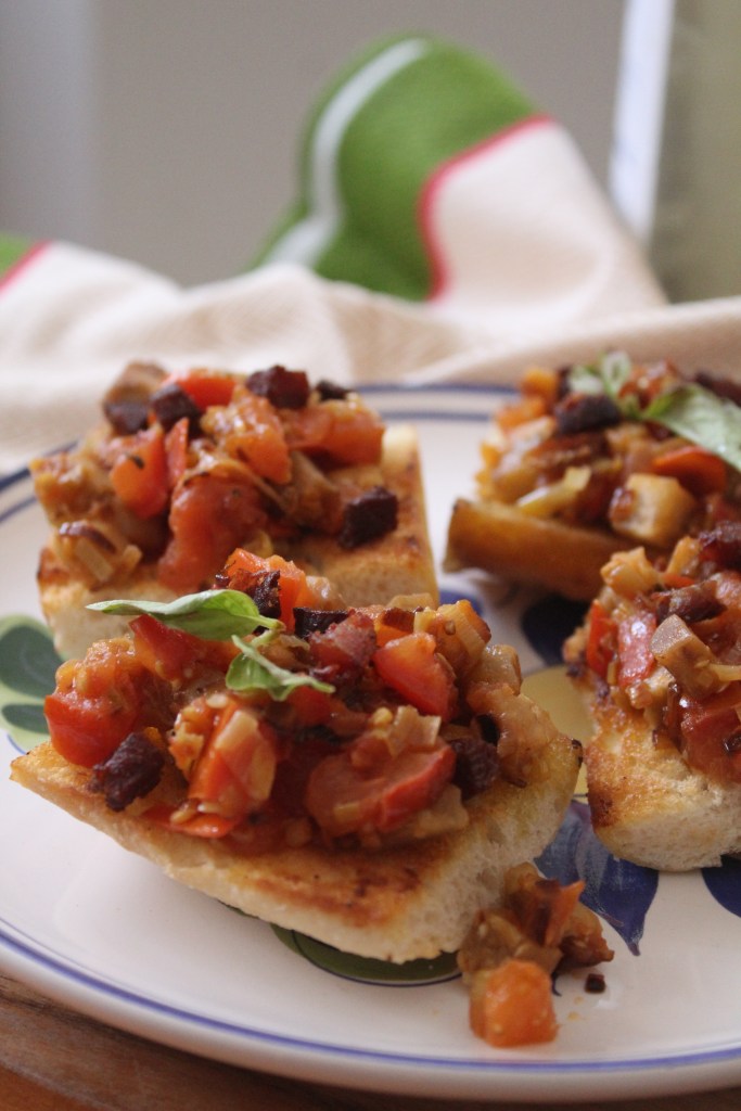 Por fim, montar tudo: colocar a mistura de tomate em cima do pão torrado, e depois uns pedaços de chouriço. Enfeitar com nova folha fresca de manjericão.