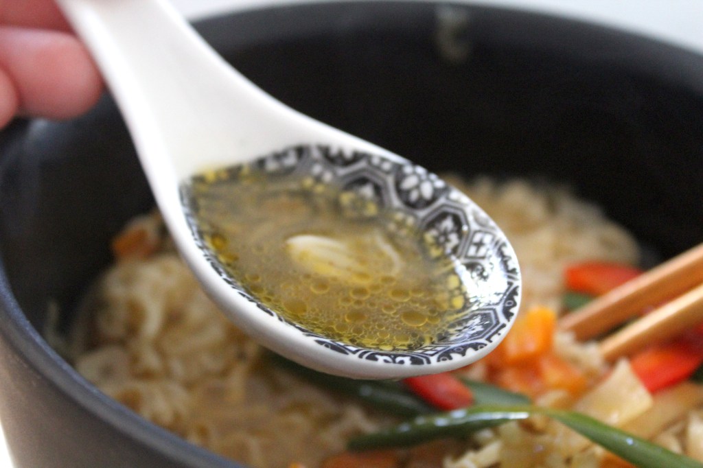 - Combine the vegetables and the broth you previously saved in the wok again, along with the noodles when they’re ready. If necessary, add a bit more water – you can use the water from the noodle cooking.